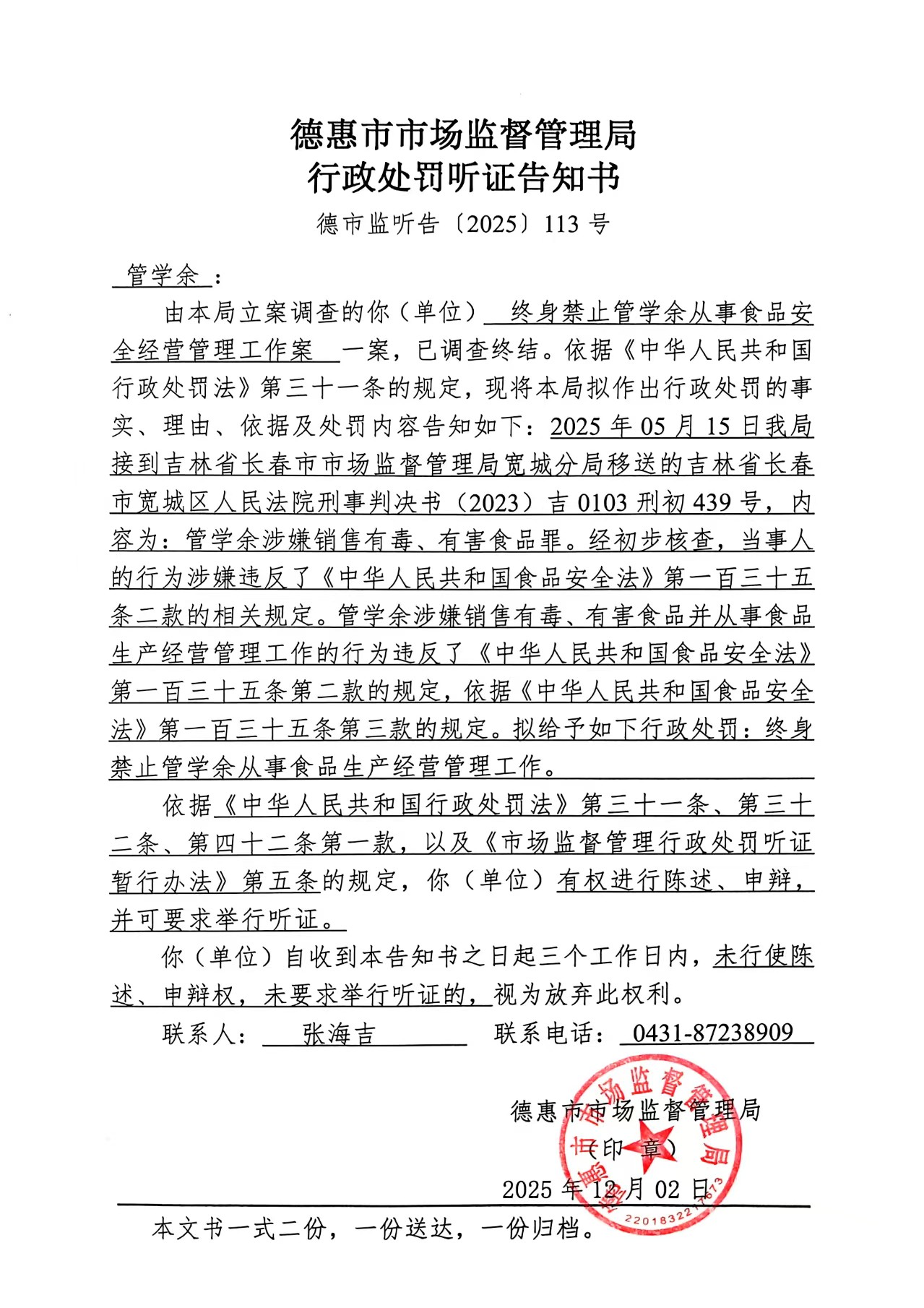 终身禁止管学余从事食品安全经营管理工作行政处罚听证告知书