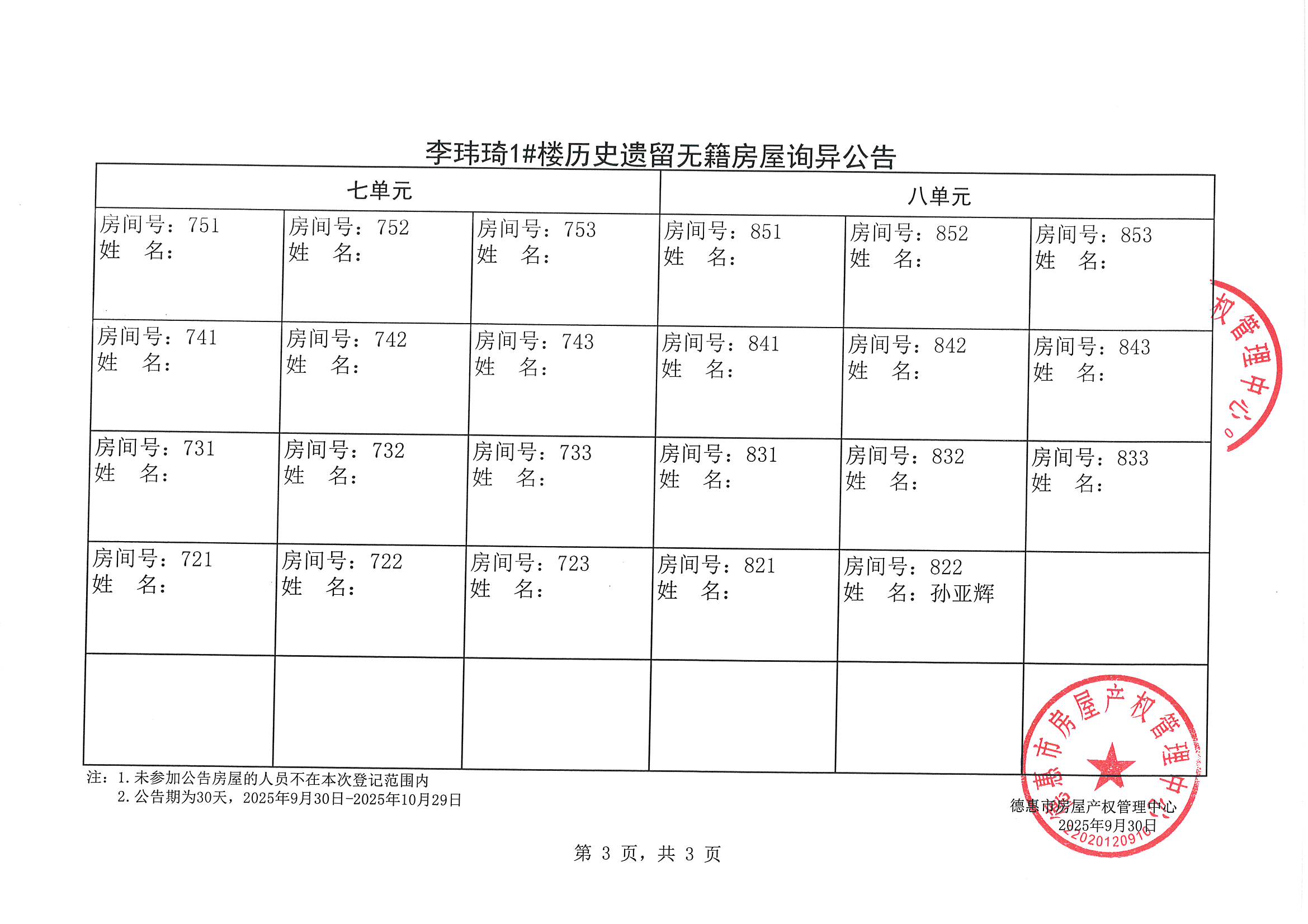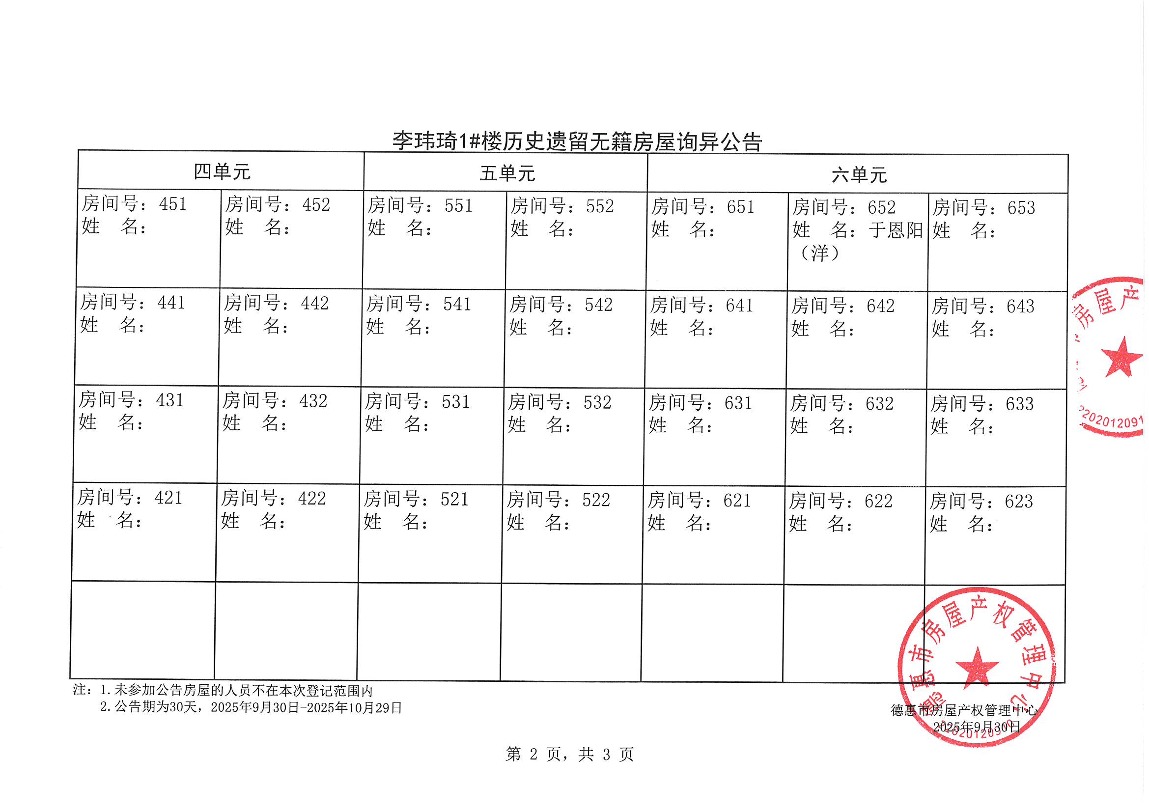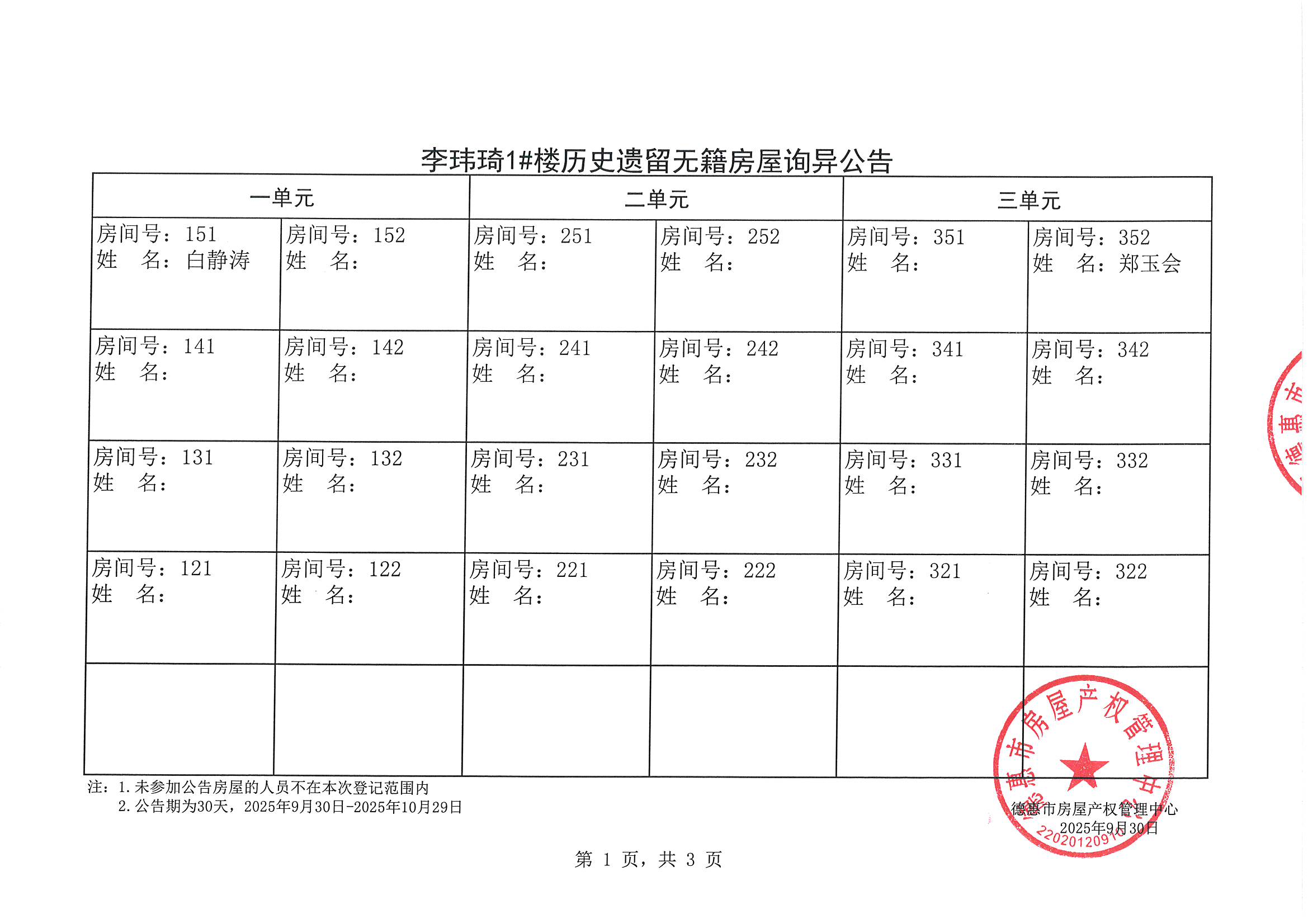 李玮琦1#楼历史遗留无籍房屋询异公告