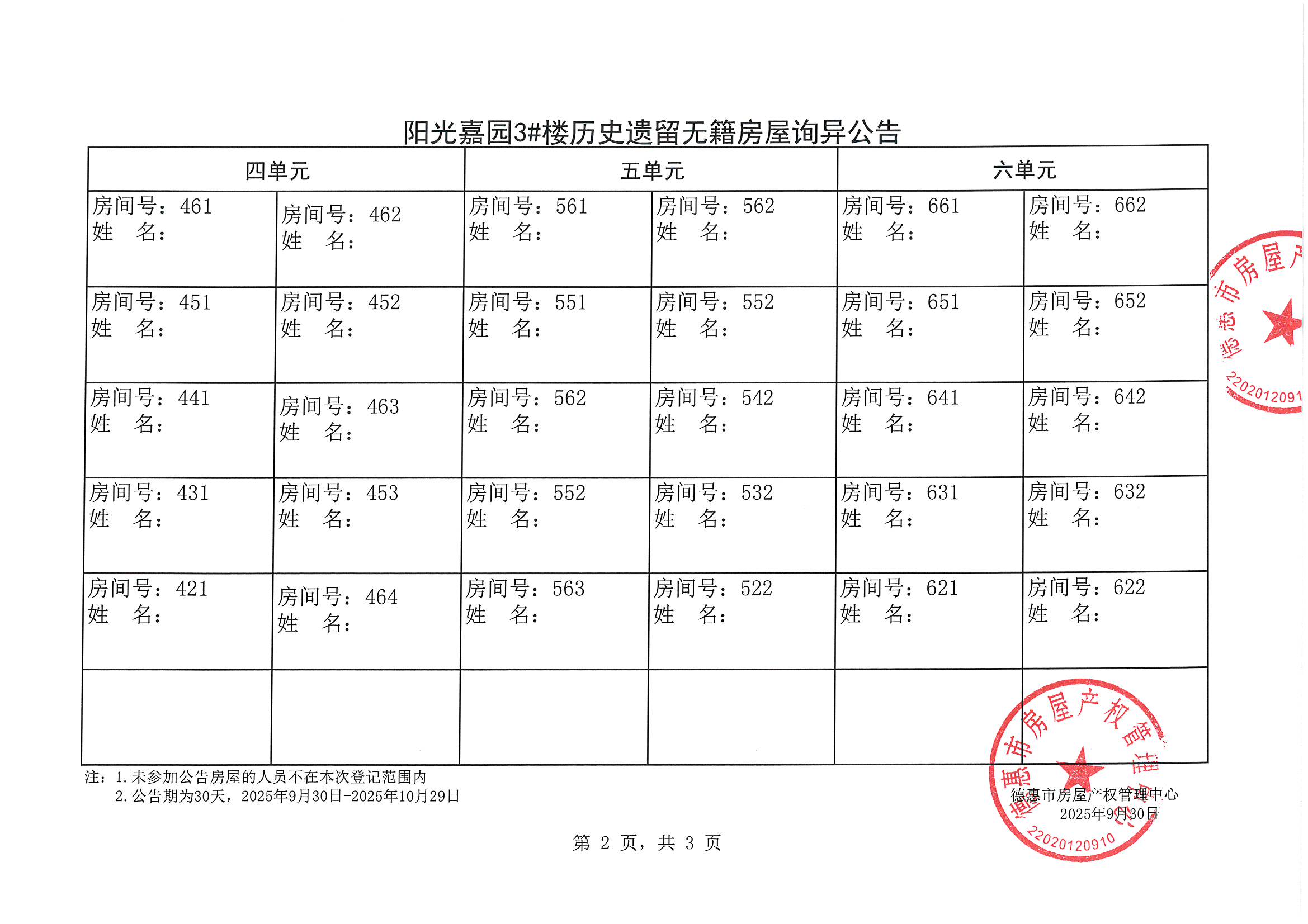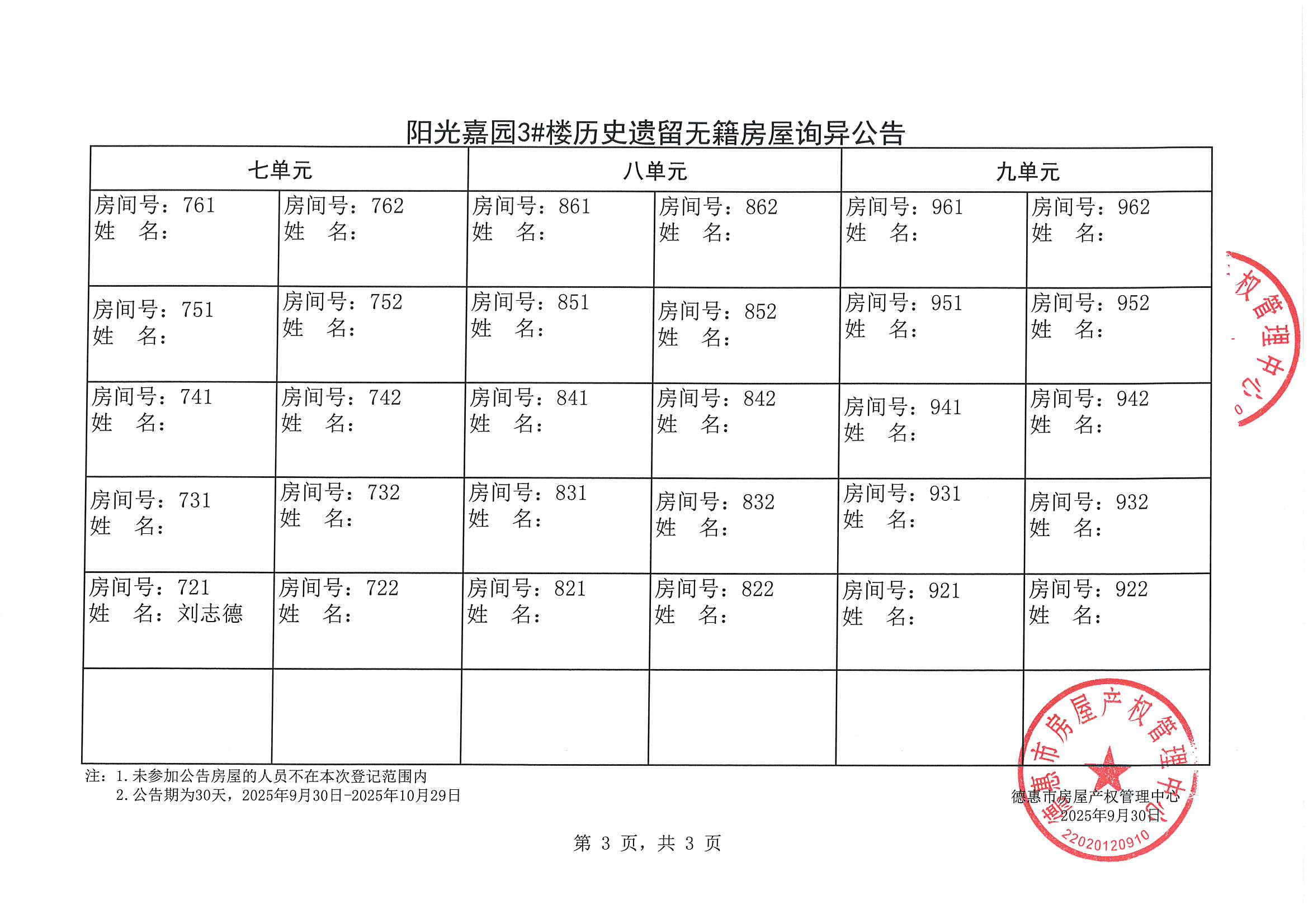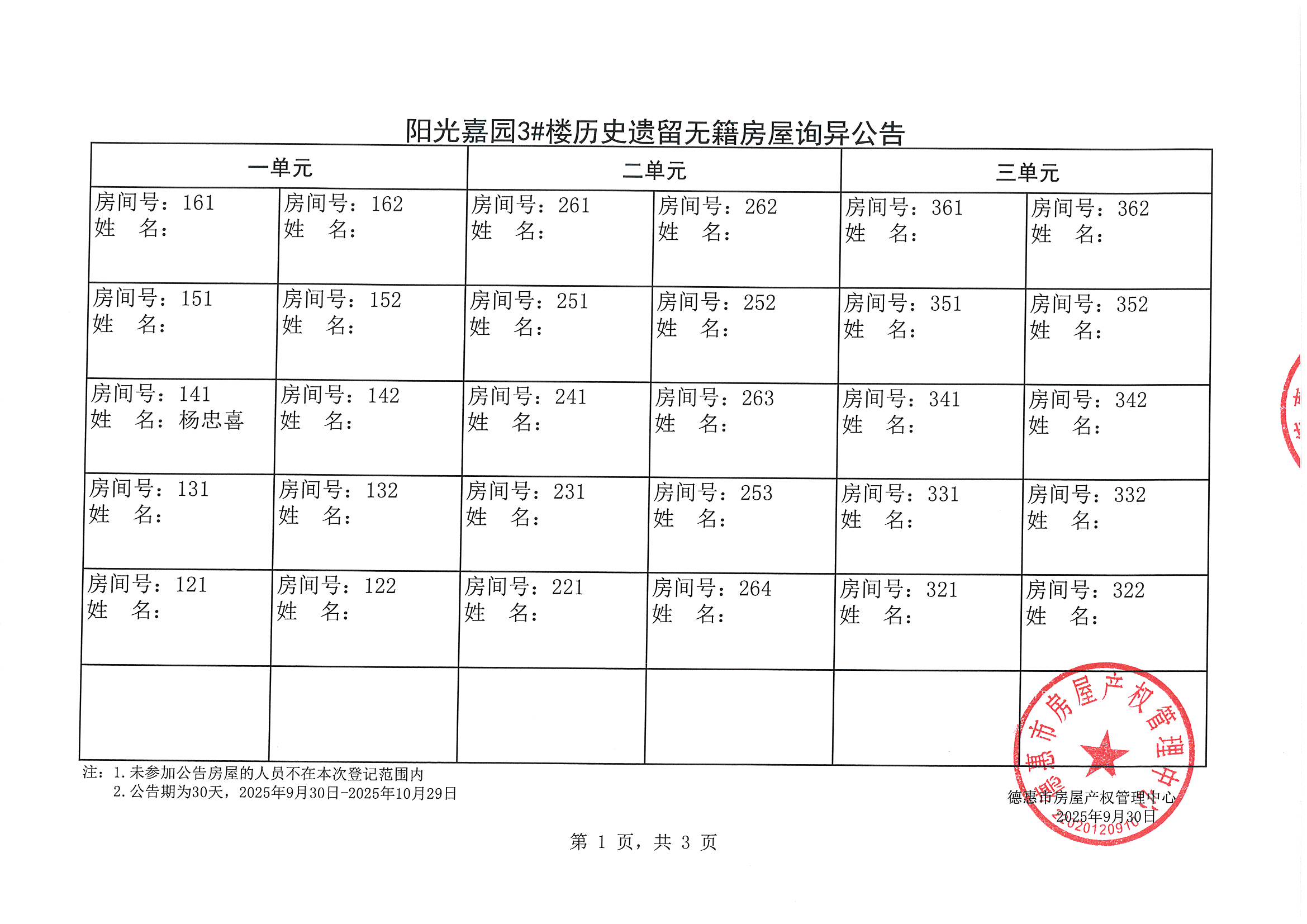 阳光嘉园3#楼历史遗留无籍房屋询异公告